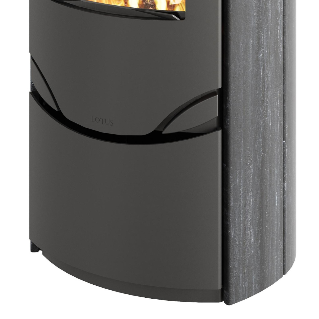 Dieser Lotus Kaminofen ist mit natürlichem Indian-Night-Stein verkleidet und handpoliert. Jeder einzelne Stein wird von Hand bearbeitet und sorgfältig verarbeitet. Farbunterschiede, natürliche Einschlüsse sowie eine ungleiche Oberflächenstruktur sind kein Makel, sondern ein Qualitätsmerkmal echten Natursteins. Auch leichte Maßtoleranzen sind normal und unterstreichen den Unikat-Charakter.