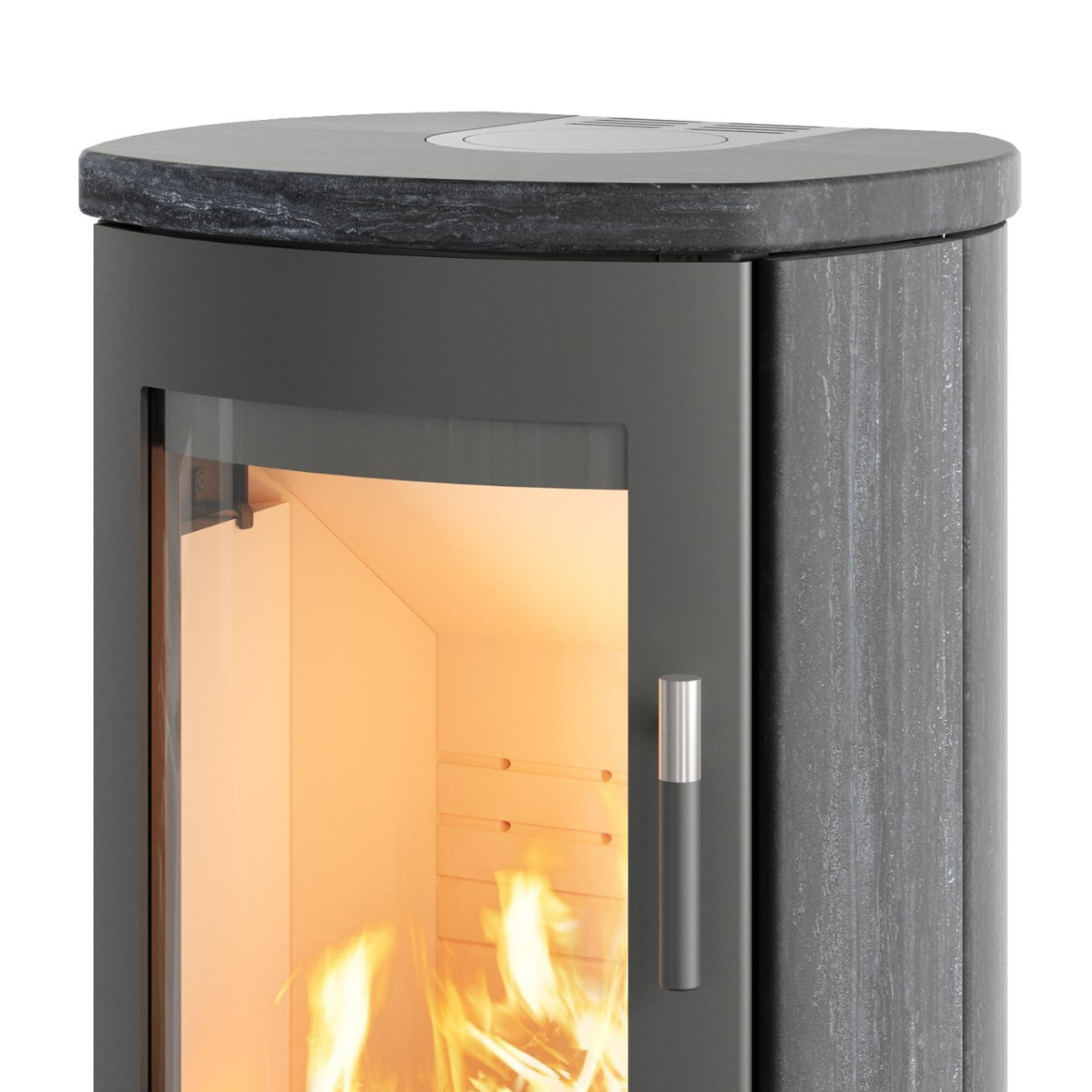 Jeder Lotus Kaminofen mit Natursteinverkleidung ist ein Einzelstück. Der Naturstein Indian Night stammt – wie der Name vermuten lässt – aus Indien. Er ist dunkler und deutlich strukturierter als klassischer Speckstein und verfügt über eine strapazierfähige, pflegeleichte Oberfläche.