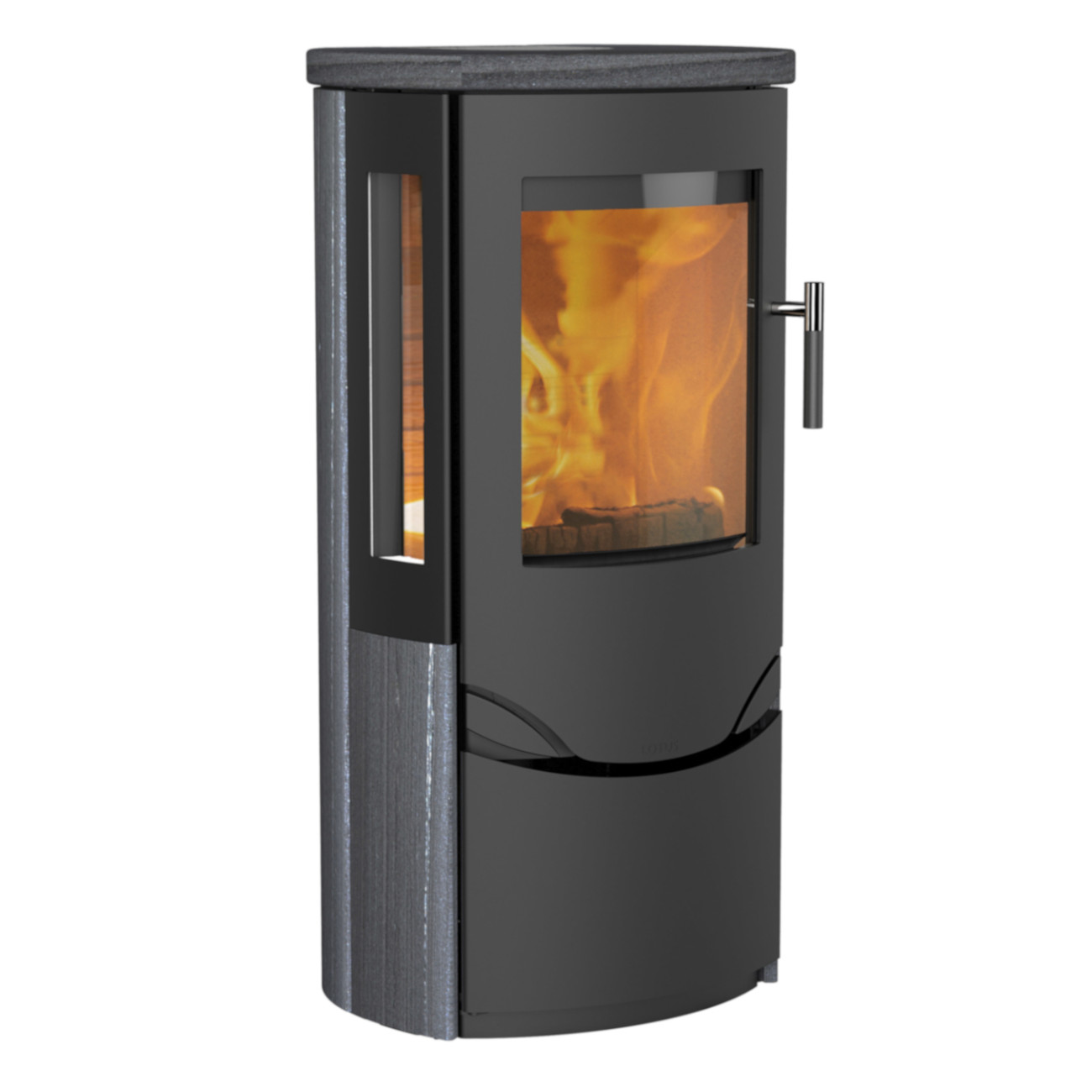 Die Verbindung aus robustem schwarzem Stahlkorpus und handverarbeitetem Naturstein macht diesen Kaminofen nicht nur optisch besonders edel, sondern sorgt auch für eine außergewöhnlich lange Lebensdauer. Ein Kaminofen, der Design, Effizienz und natürliche Materialien perfekt miteinander verbindet.