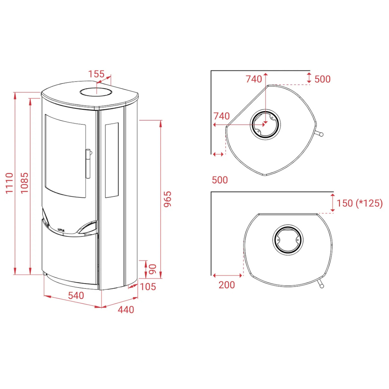 - Abstand von Mitte des Rauchstutzens bis zur Hinterkante des Ofens: 15,5 cm