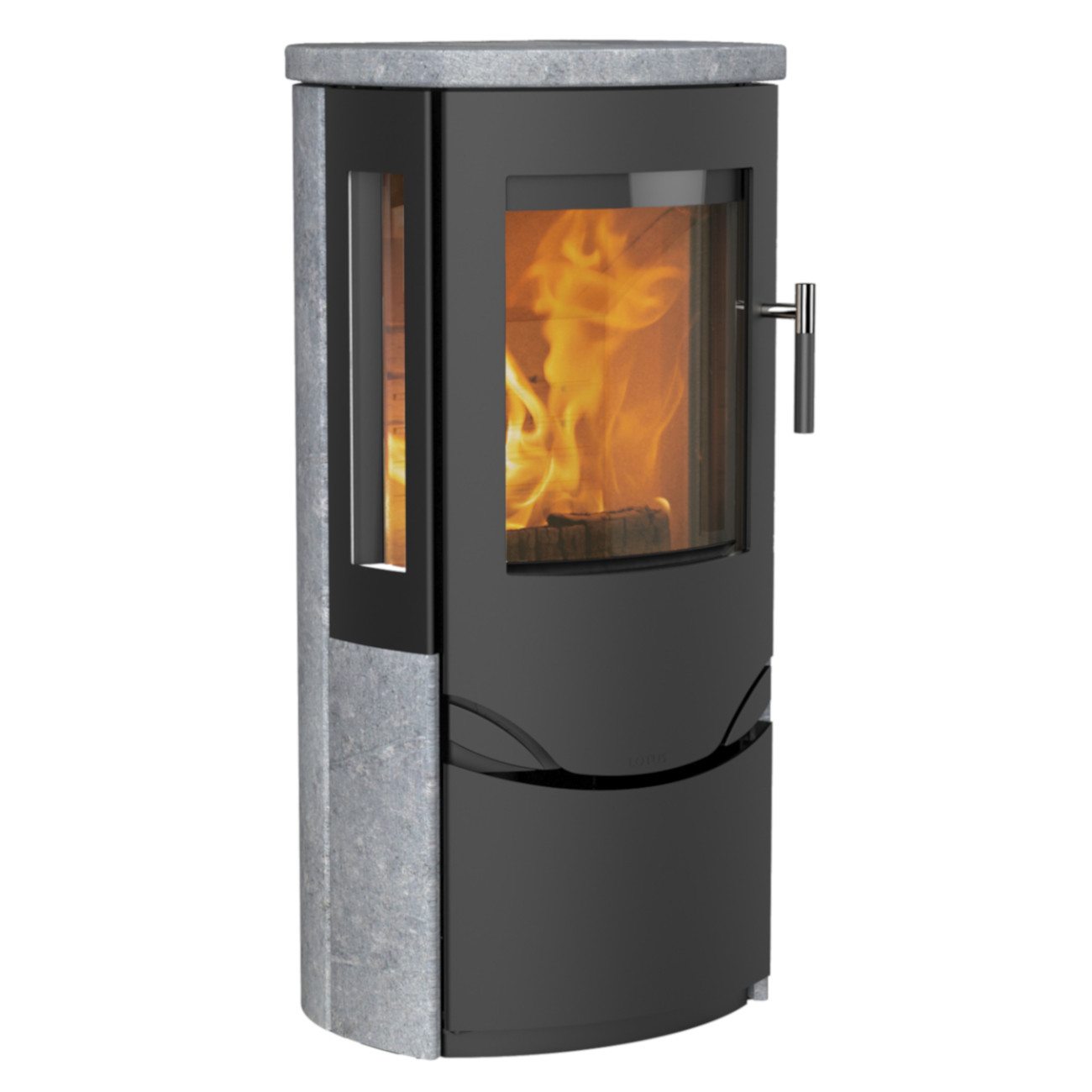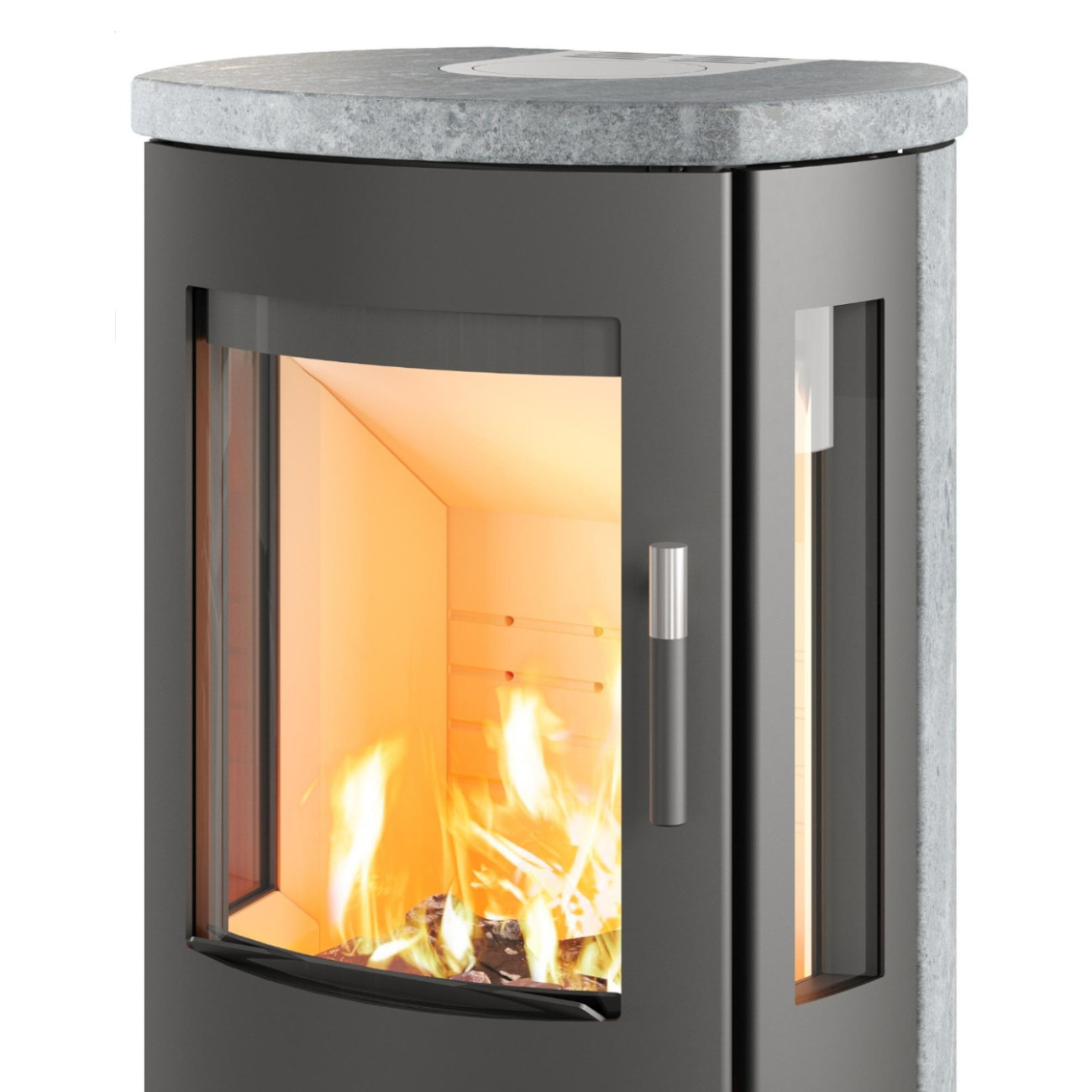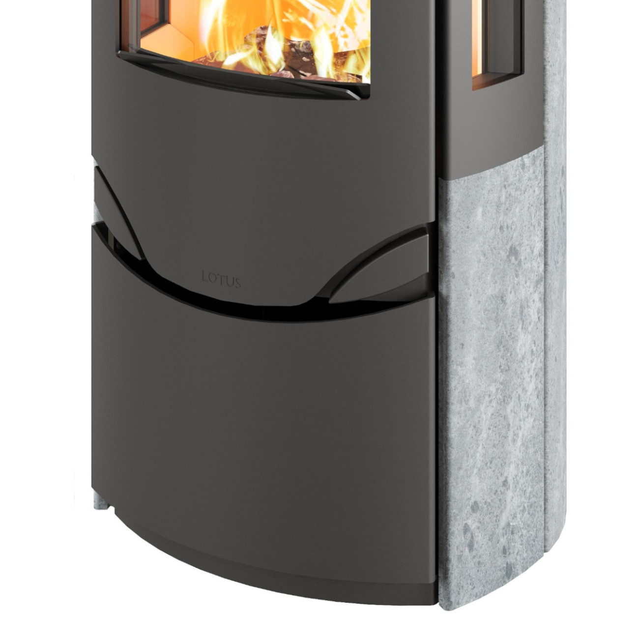Lotus Prio 6 Panorama Speckstein Kaminofen 7 kW Schwarz – 3-Seitige-Feuersicht mit Naturstein