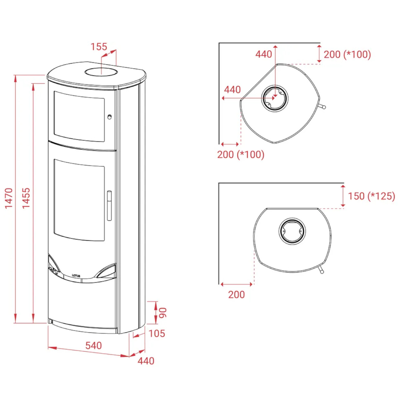 - Abstand von Mitte des Rauchstutzens bis zur Hinterkante des Ofens: 15,5 cm