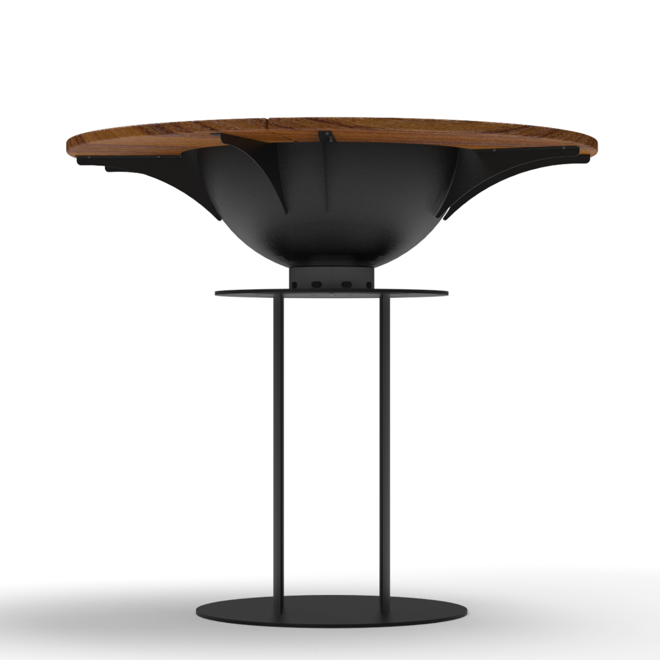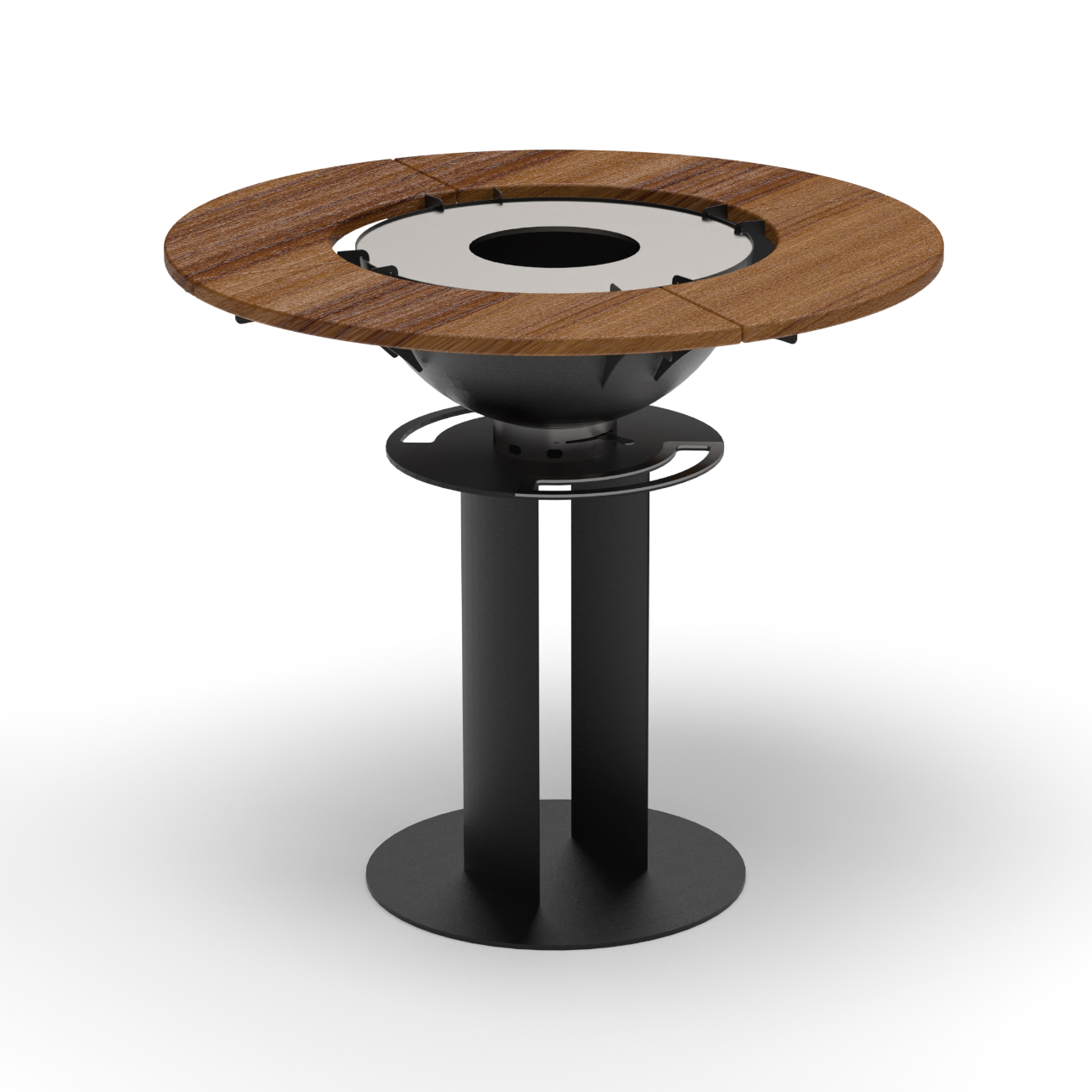 Der Tisch ist aus exotischem Massivholz gefertigt – langlebig, witterungsresistent und angenehm in der Haptik. Durch das klare, moderne Design passt sich BAR 600 harmonisch an die Form der Feuerstelle an und unterstreicht den edlen Charakter Ihres Grills.