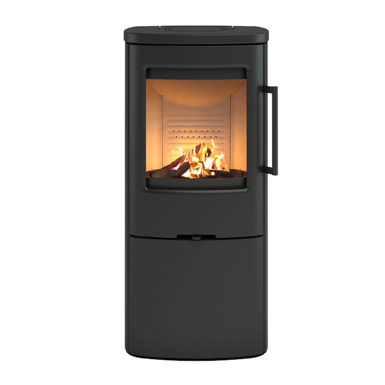 Die abgerundeten Stahlseiten in Schwarz verleihen dem Ofen eine besonders harmonische Formensprache. Tür und Topplatte bestehen aus massivem Gusseisen und unterstreichen die hochwertige Verarbeitung.