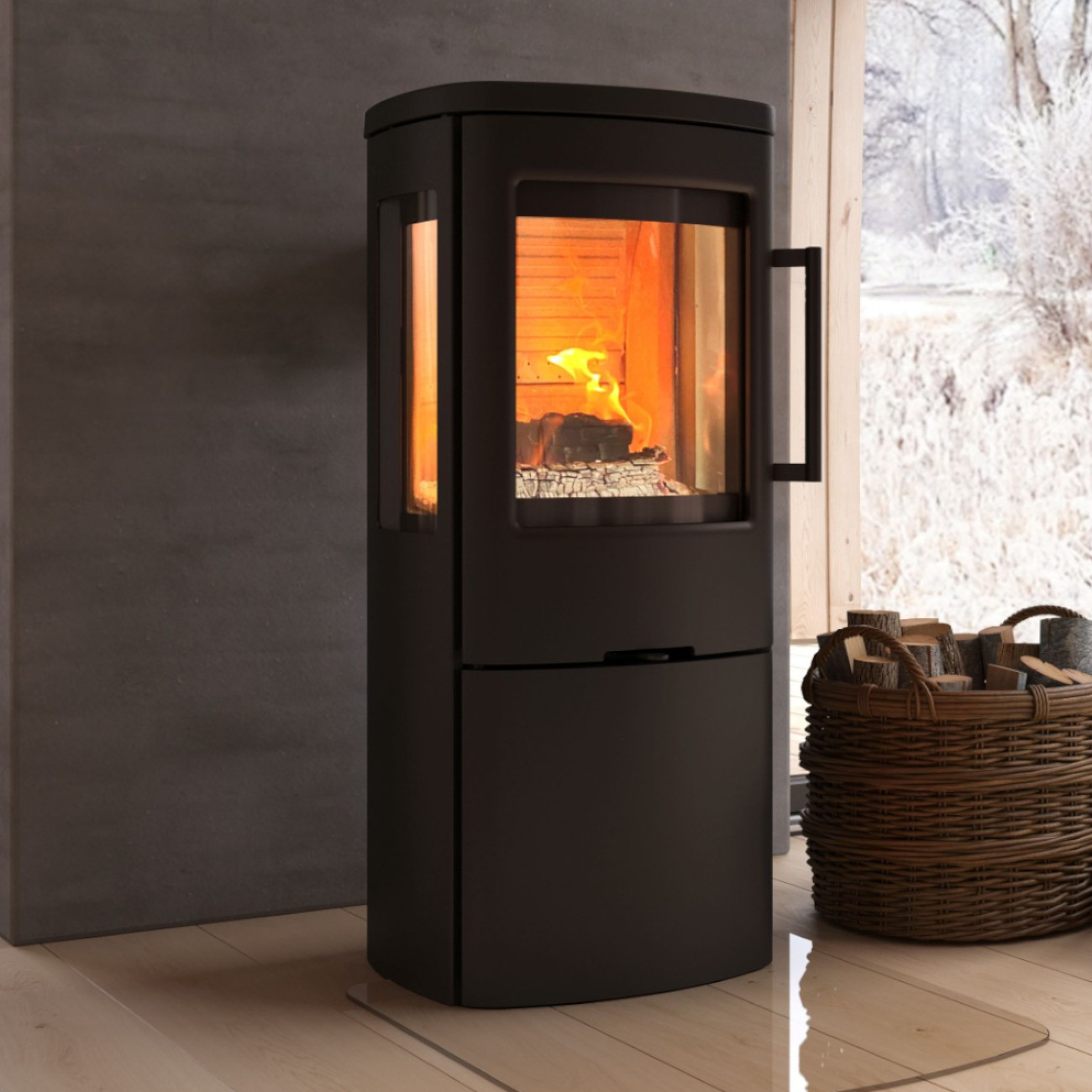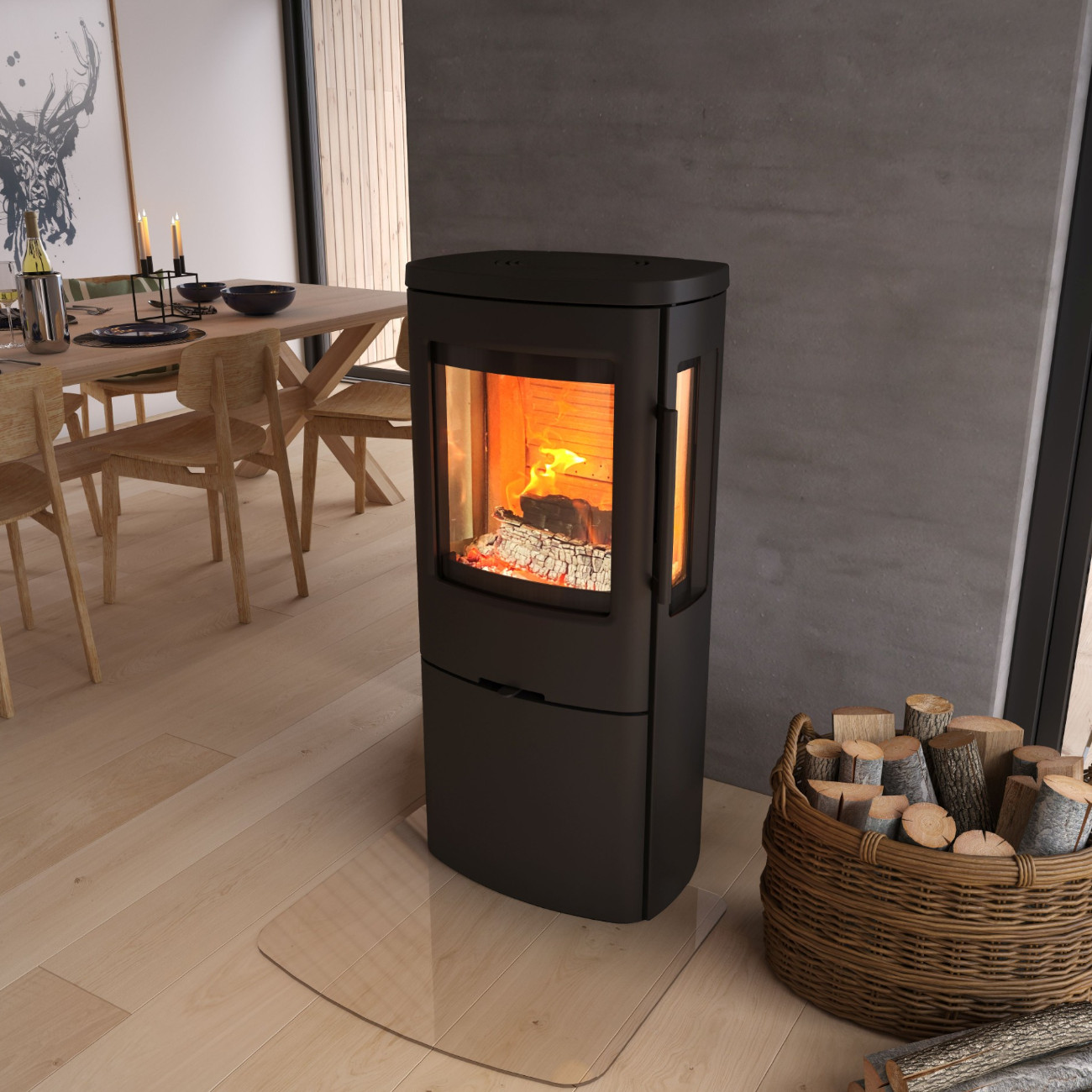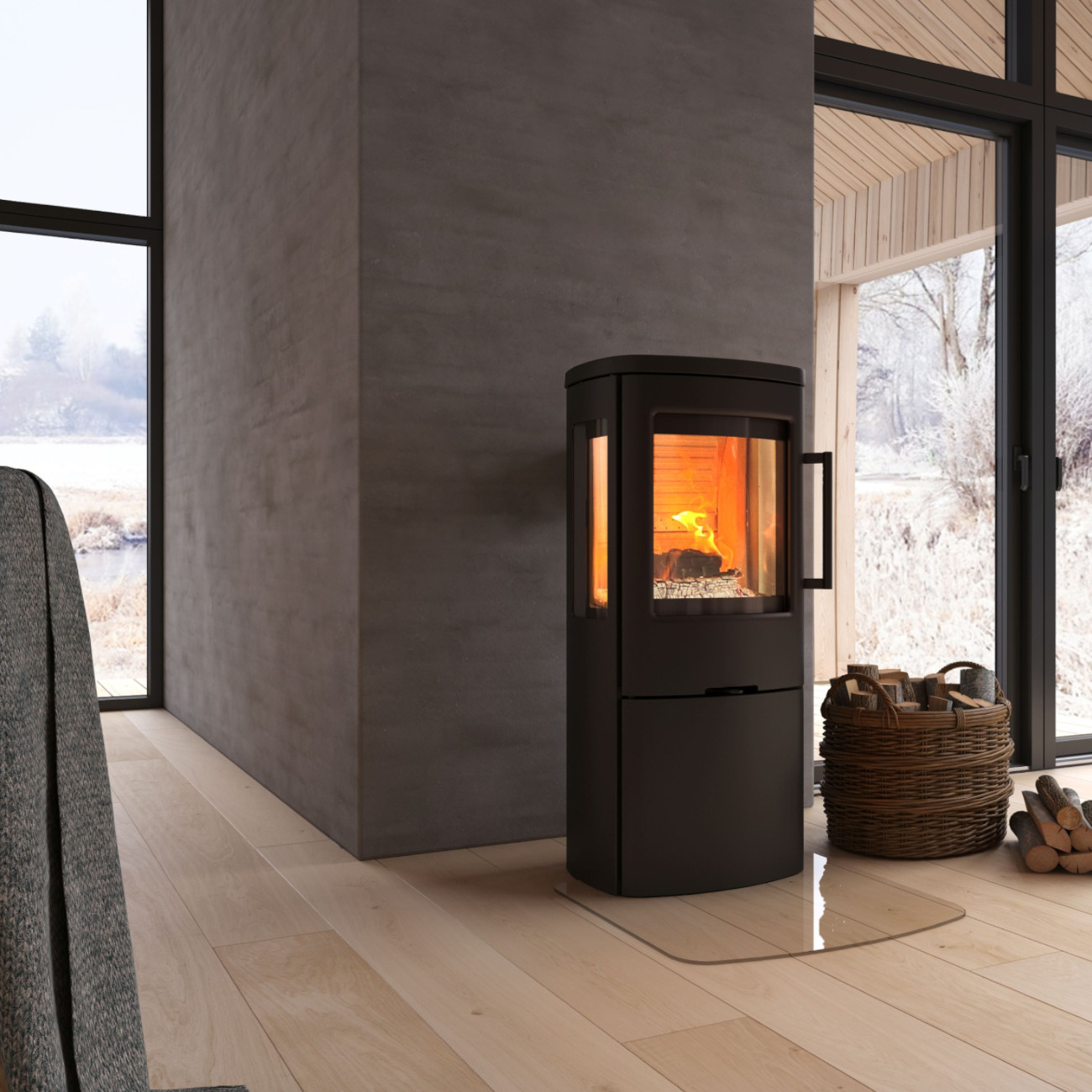 Die doppelverglasten Seitenscheiben sorgen zusätzlich für einen wichtigen Sicherheitsvorteil: Sie reduzieren die Oberflächentemperatur der Scheiben und ermöglichen dadurch einen geringeren seitlichen Abstand zu brennbaren Materialien. Das erleichtert die Integration des Ofens in verschiedene Wohnsituationen.