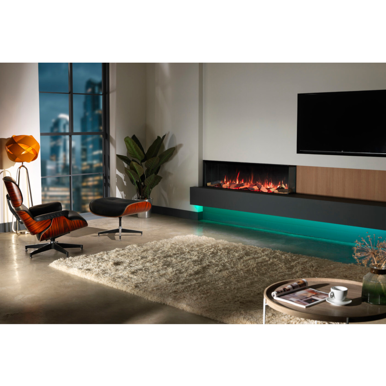 Die zusätzliche Beleuchtung erweitert die Atmosphäre über das Feuer hinaus und schafft eine weitere interaktive Dimension im Raum.
