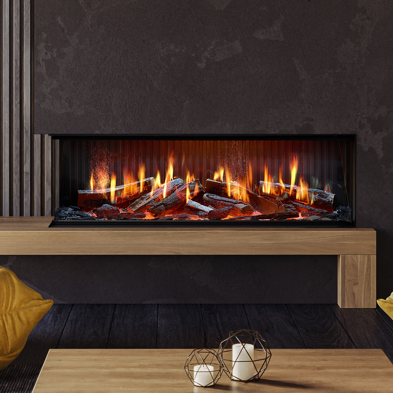 Der Trimline iX13 Solus arbeitet mit einem aufwändigen Arrangement optischer Illusionen, das den Raum mit einem dreidimensionalen Flammenbild füllt. Die hochwertige Verarbeitung und die herausragende Flammentechnik machen diesen Elektrokamin zu einem echten Statement – ideal für Medienwände, moderne Wohnkonzepte und designorientierte Räume.