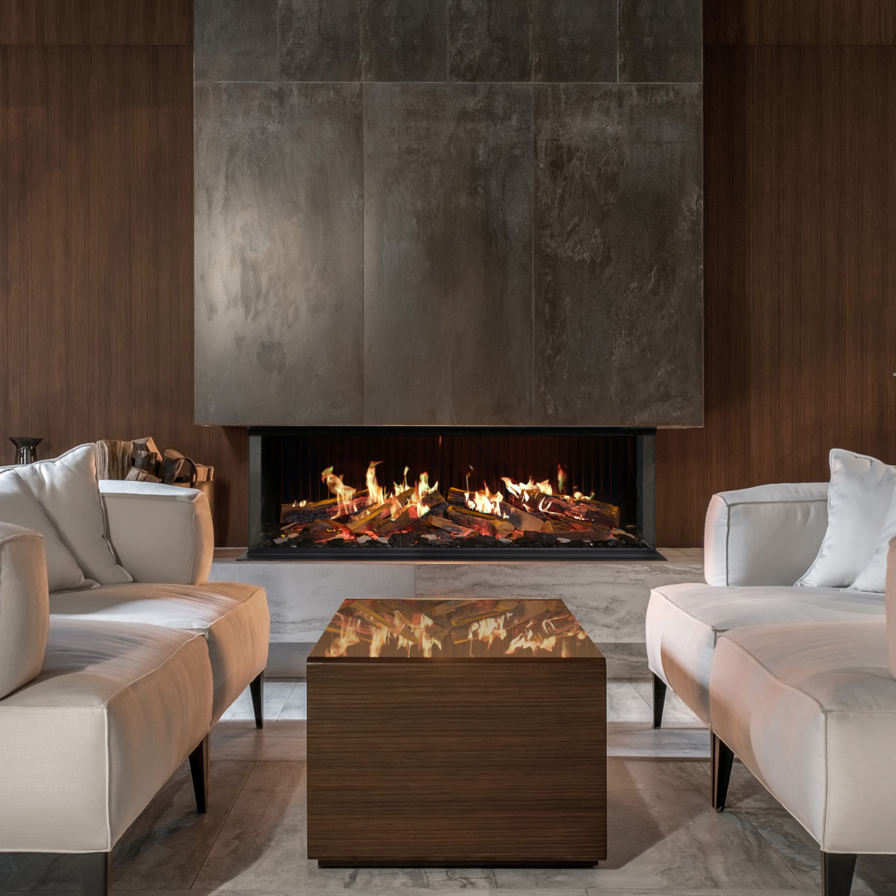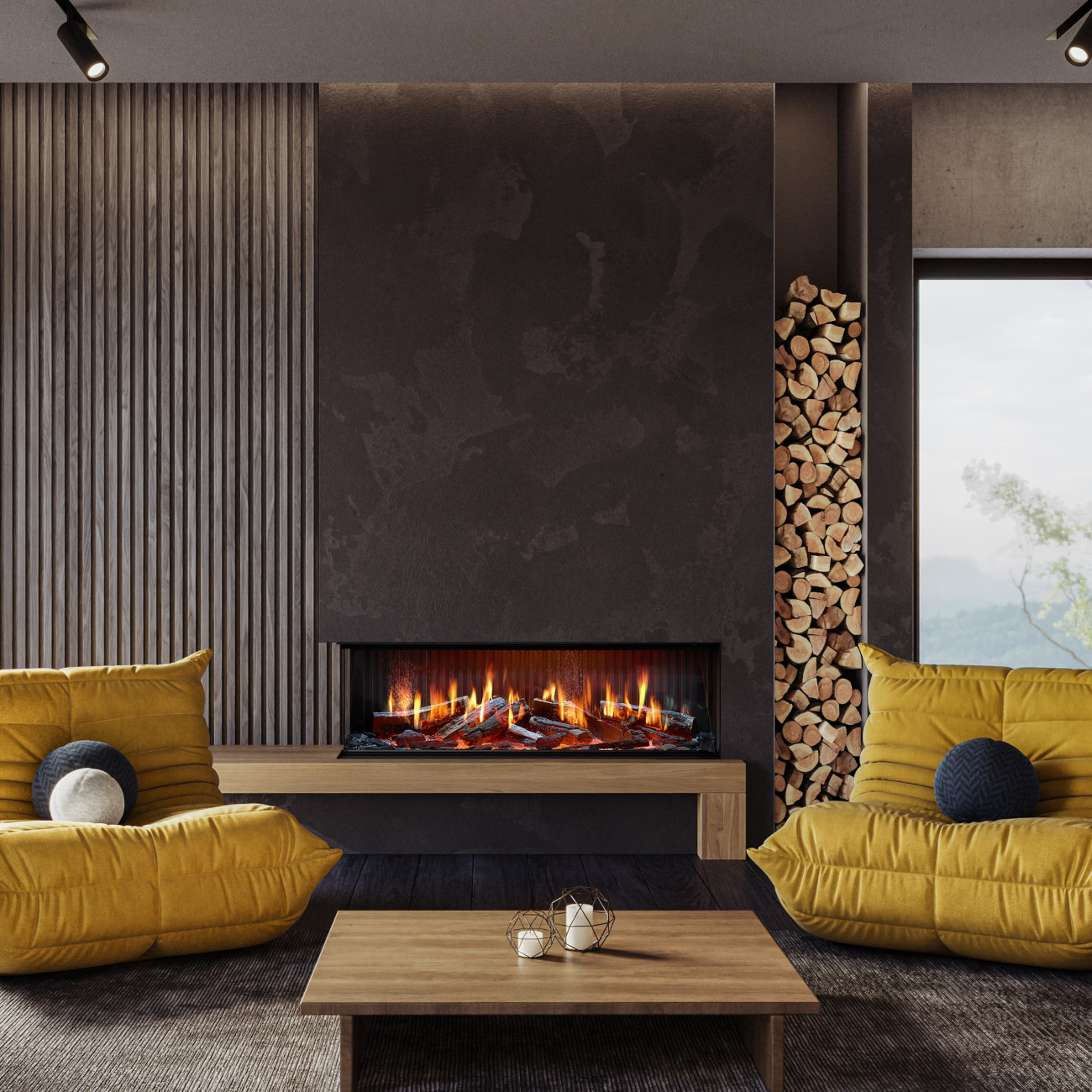 Licht & Atmosphäre: Holzscheite, Glutbett und Downlight separat regelbar