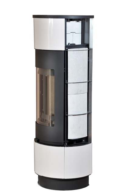 Optional lässt sich der Kaminofen zusätzlich mit Speichersteinen (bis zu 42,5 kg) ausstatten. Diese bestehen aus zwei oberen Speicherringen und vier seitlichen Speichersteinen. So gibt der Ofen die Wärme auch nach Erlöschen des Feuers über mehrere Stunden ab – bis zu 7 Stunden Wärmespeicherung in einem gut isolierten Gebäude.