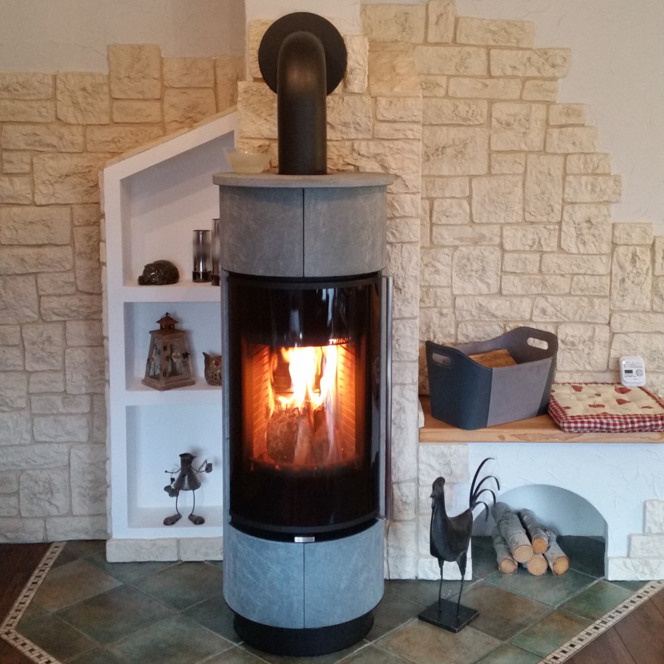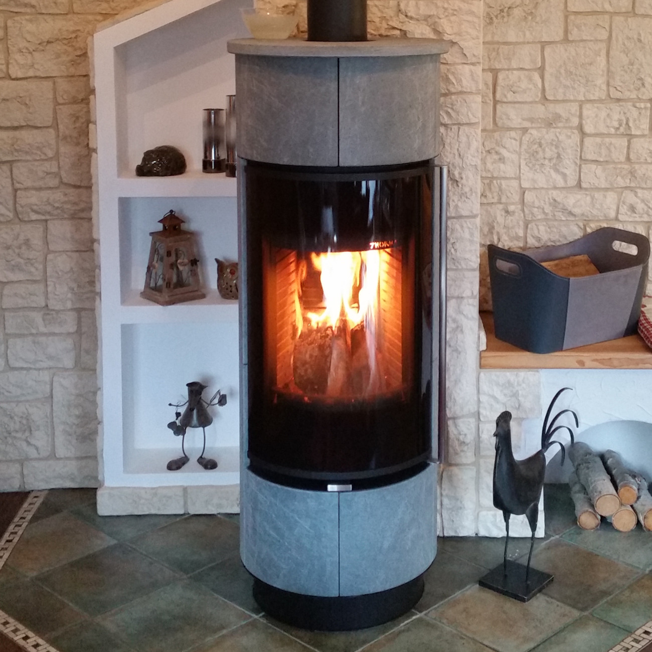 Die edle Verkleidung aus italienischem Serpentinostein überzeugt nicht nur optisch, sondern auch durch hervorragende Wärmespeichereigenschaften. Unter Druck und hohen Temperaturen in tiefen Gesteinsschichten entstanden, speichert der Serpentino Stein die Wärme wie ein natürlicher Akku und sorgt für ein wohlig warmes Ambiente.