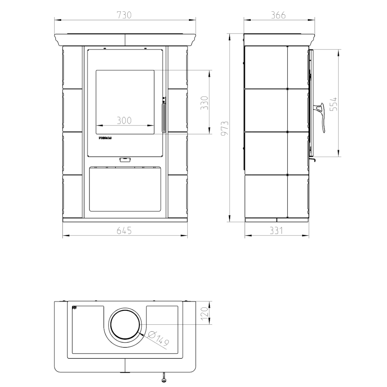 - Abstand von Mitte des Rauchstutzens bis zur Hinterkante des Ofens: 11,86 cm