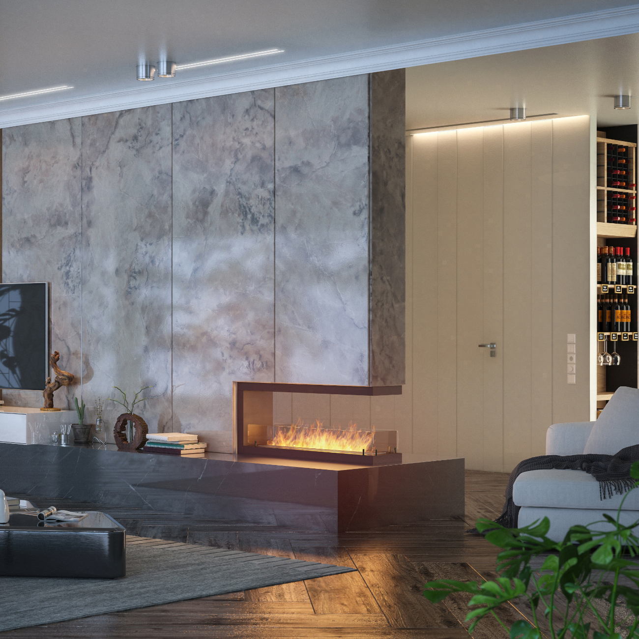 Dank seiner einzigartigen Konstruktion kann der Kamin harmonisch zwischen Küche und Wohnzimmer, zwischen Flur und Wohnbereich oder sogar in offenen Loft-Wohnungen integriert werden. So schafft er eine warme, einladende Atmosphäre und verbindet gleichzeitig zwei Räume auf elegante Weise.