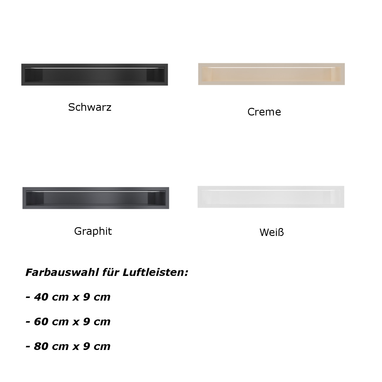 - Warmluftgitter im Sockelbereich: 2 Stück à 17 cm x 37 cm erhältlich in 7 verschiedenen Farbe und 2 Varianten (siehe Bilder) ODER 2 Stück Luftleisten à 60 cm x 9 cm, in 4 verschiedenen Farben (siehe Bilder)