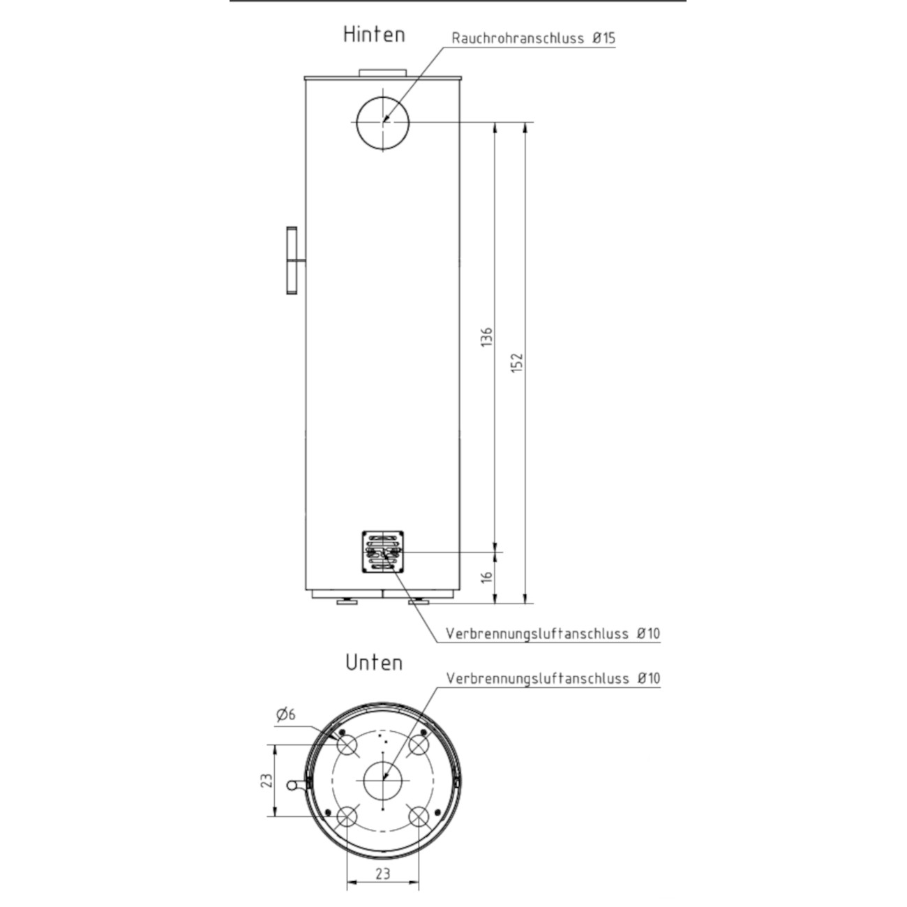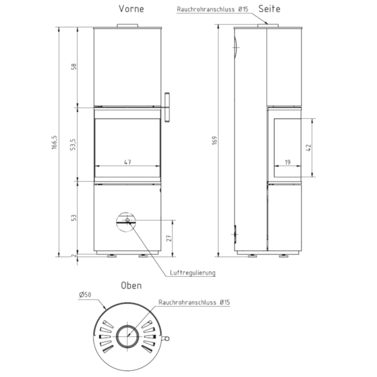 - Abstand von Mitte des Rauchstutzens bis zur Hinterkante des Ofens: 25 cm