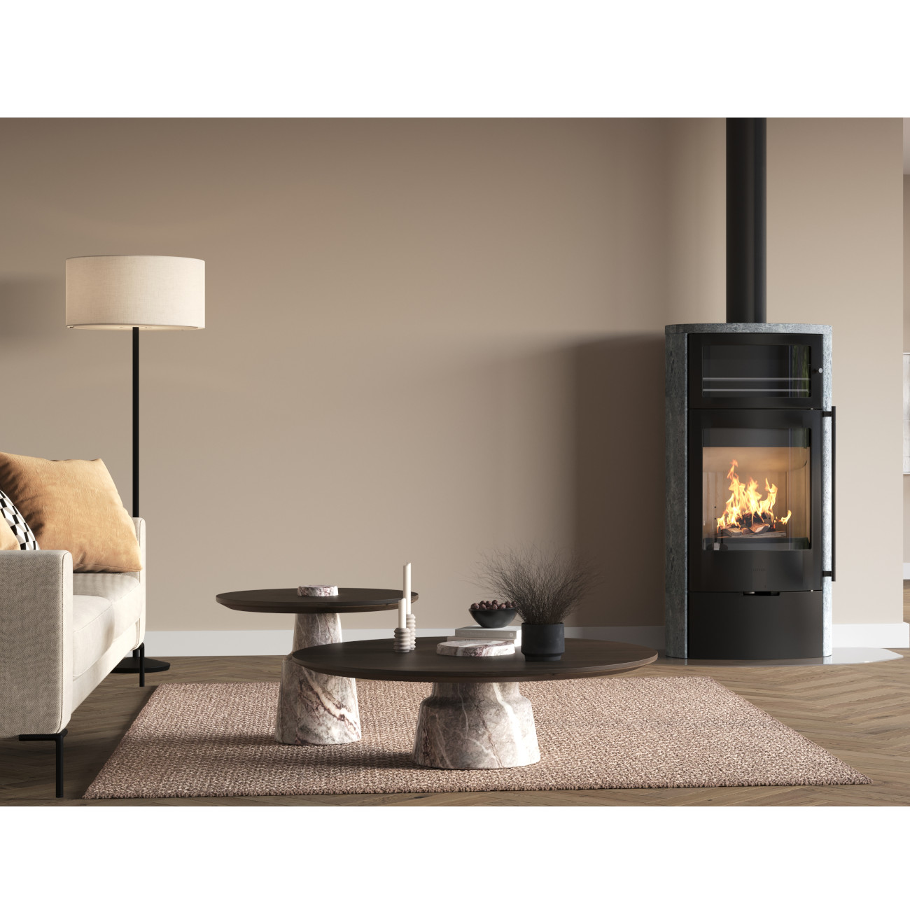 - Hochwertige Specksteinverkleidung für natürliche Optik und effiziente Wärmespeicherung