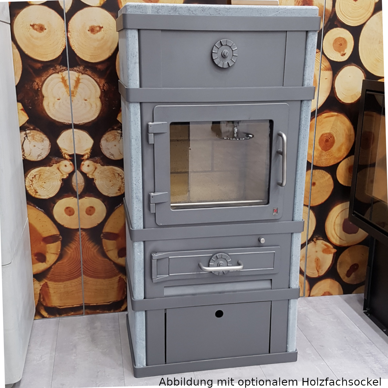 - Brennholzsockel mit Specksteinverkleidung (Höhe: ca. 25 cm) – für zusätzlichen Stauraum und längere Wärmespeicherung.