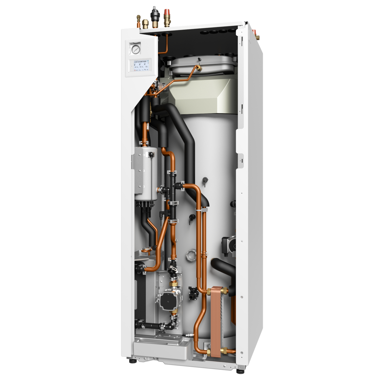 - Integrierter 200/300 l Trinkwassertank mit Sensoren, Hocheffizienzpumpe, Trinkwarmwasser-Umschaltventil und Sicherheitsgruppe