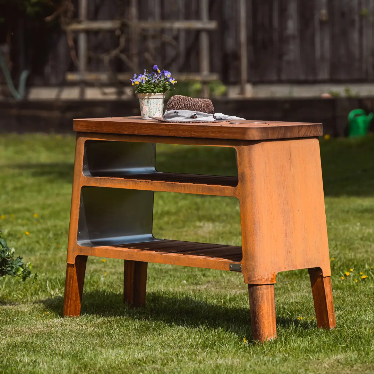 - Material: Cortenstahl, exotisches Hartholz