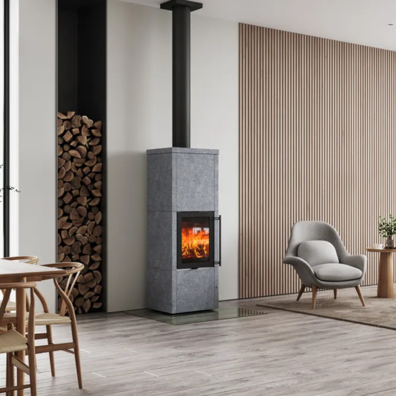 Speckstein ist ein Mineral, das in Ländern wie Finnland, Norwegen und Brasilien vorkommt. Charakteristisch für dieses Naturmaterial ist seine weiche, lebendige Oberfläche. Speckstein wird häufig für die sogenannten Speicheröfen oder als Seitenverkleidung bei herkömmlichen Kaminöfen verwendet, da er über eine hervorragende Fähigkeit zur Wärmespeicherung verfügt. Er ist wie kein anderes Material in der Lage, Wärme viele Stunden lang zu speichern und langsam abzugeben, nachdem das Feuer bereits erloschen ist. Speckstein ist ein von der Natur geschaffenes Material, dessen natürliche Variation in Struktur und Oberflächenbeschaffenheit jeden Stein und Ofen einzigartig macht.