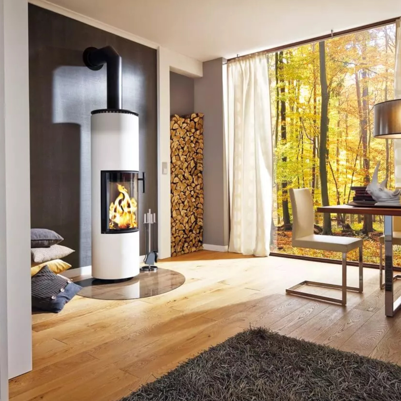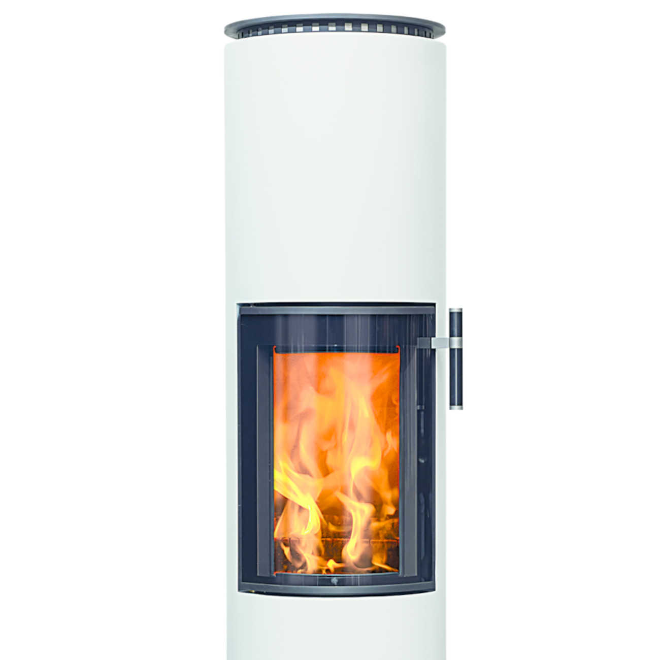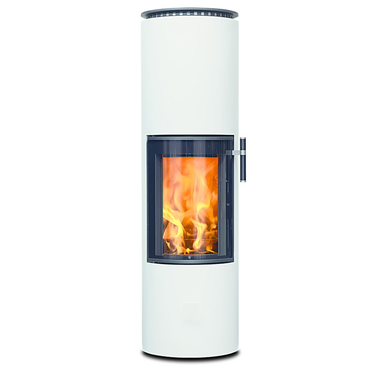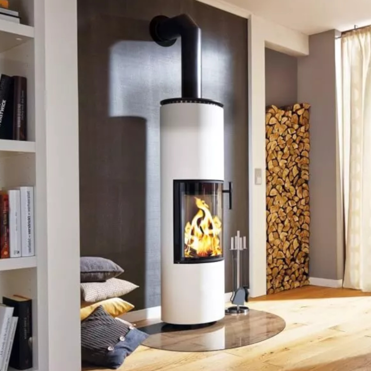 Die klare, helle Farbgebung setzt einen bewussten Kontrast zum dunklen Feuerraum und dem lebendigen Flammenbild. Dadurch rückt das Feuer noch stärker in den Mittelpunkt und wird zum visuellen Highlight Ihres Wohnraums.