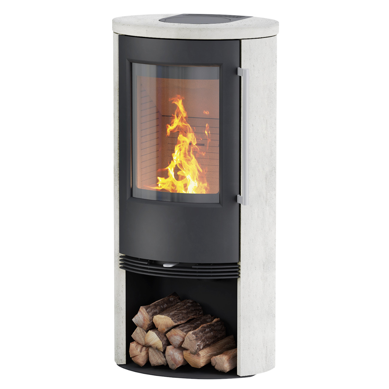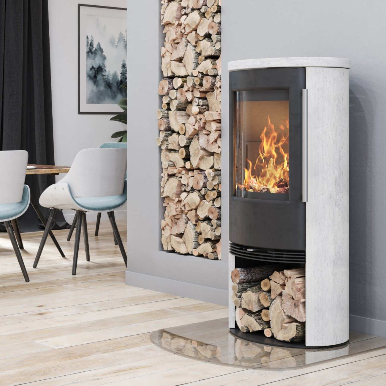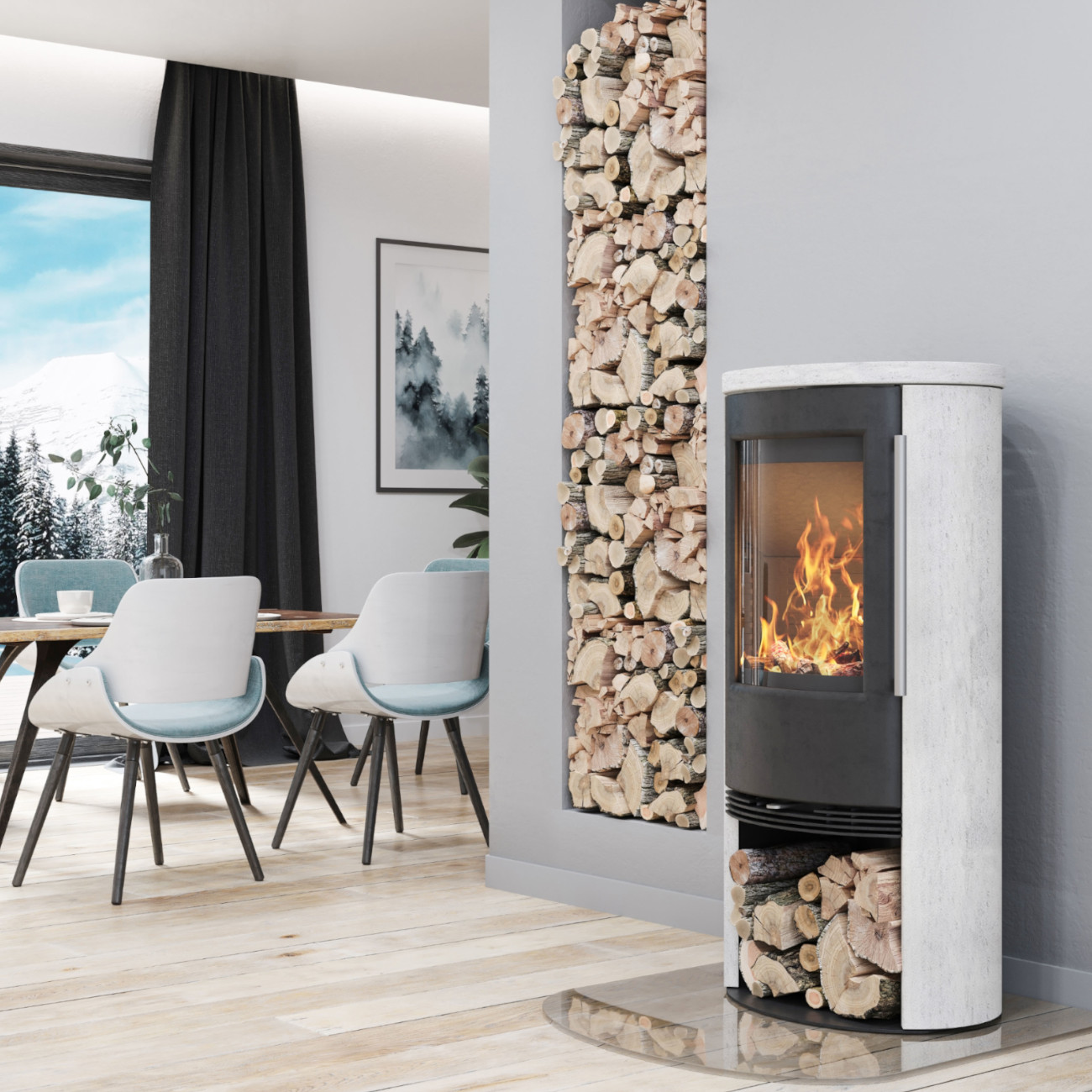 Der TT21R Kaminofen kombiniert das bewährte Konzept der TT20-Serie mit einem ellipsenförmigen Design und hochwertigen Materialien wie Gusseisen und natürlichem Sandstein.