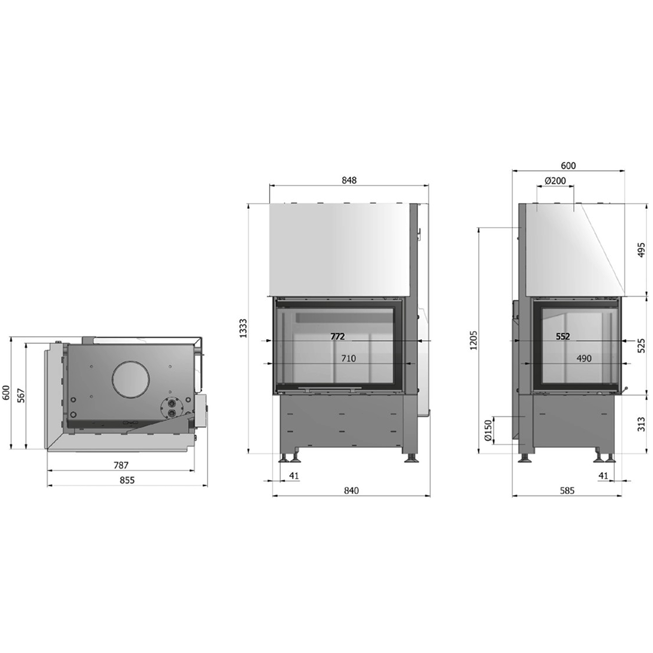 Modell: Hajduk Volcano WPTH 12 Wassergeführter-Kamineinsatz Rechts Verglast Steglos mit Rahmenloser Hebetür mit gebogenen Glas